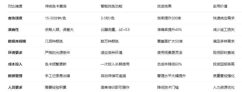傳統色卡查詢主要依賴人工視覺比對,存在諸多固有缺陷。查詢過程耗時費力,專業人員需要在標準光源箱下反復翻動色卡,平均每個顏色查詢需要15-30分鐘。結果受主觀因素影響大,不同觀察者的視覺感知存在差異,同一顏色可能得出不同的匹配結論。環境條件要求苛刻,必須在標準光源和特定角度下進行,否則會產生嚴重偏差。此外,色卡本身存在老化變色問題,使用過程中的污損和褪色會進一步影響查詢準確性。
