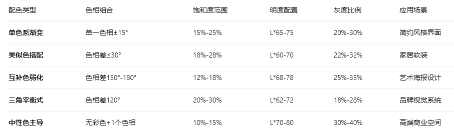 色彩過于平淡是常見問題。解決方案是引入小面積對比色,選擇色相環間隔120°-150°的色彩作為點綴,但將飽和度控制在12%-15%,明度與主色保持協調。另一種方法是使用明度對比,將關鍵元素的明度調整至與背景ΔL*≥15。